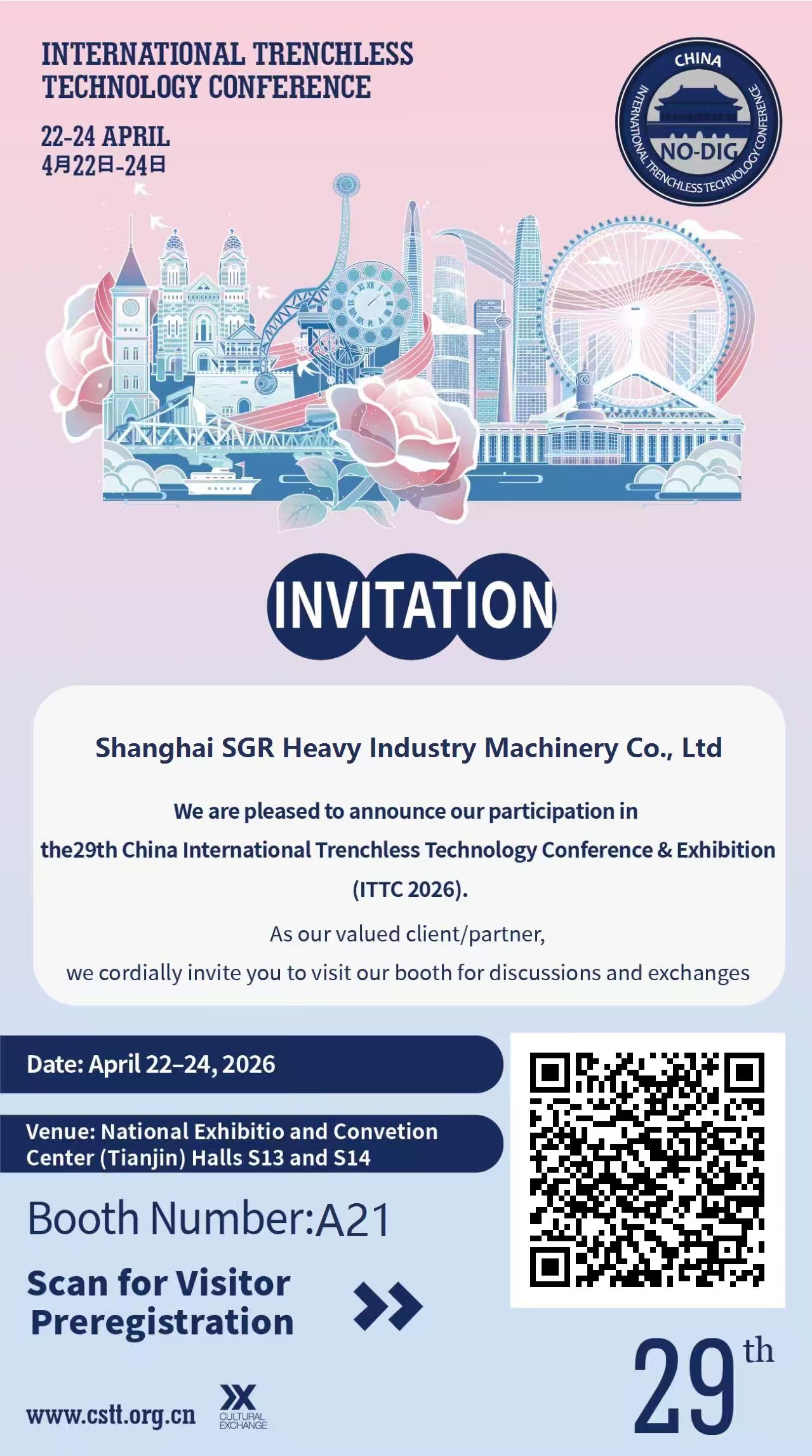 SGR bude vystavovat na 29. čínském mezinárodním semináři a výstavě bezvýkopových technologií (ITTC2026) Termíny: 22.–24. dubna 2026 Místo: Národní výstavní a kongresové centrum (Tianjin),...